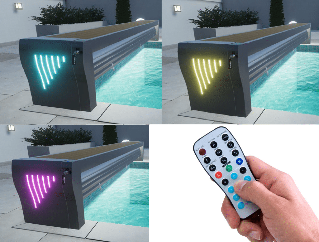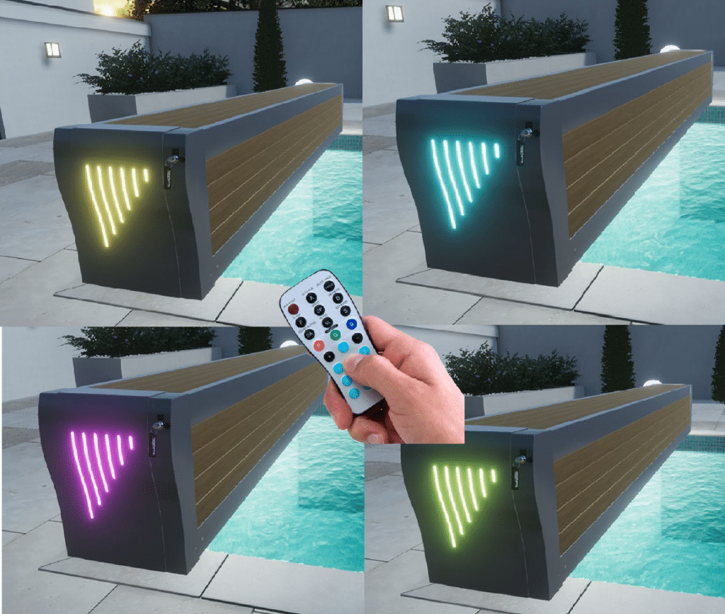 Peur que votre volet de piscine ne soit pas esthétique ou manque de cachet ? Envie d’ajouter une petite touche originale ? Grâce à la gamme personnalisable de volets de piscine de Volée d’O, vous pouvez créer grâce aux lumières LED un superbe effet garanti ! Choisissez la couleur grâce à la télécommande et laissez la magie opérer. Très belle ambiance pour prolonger vos soirées en bord de piscine en famille ou entre amis.