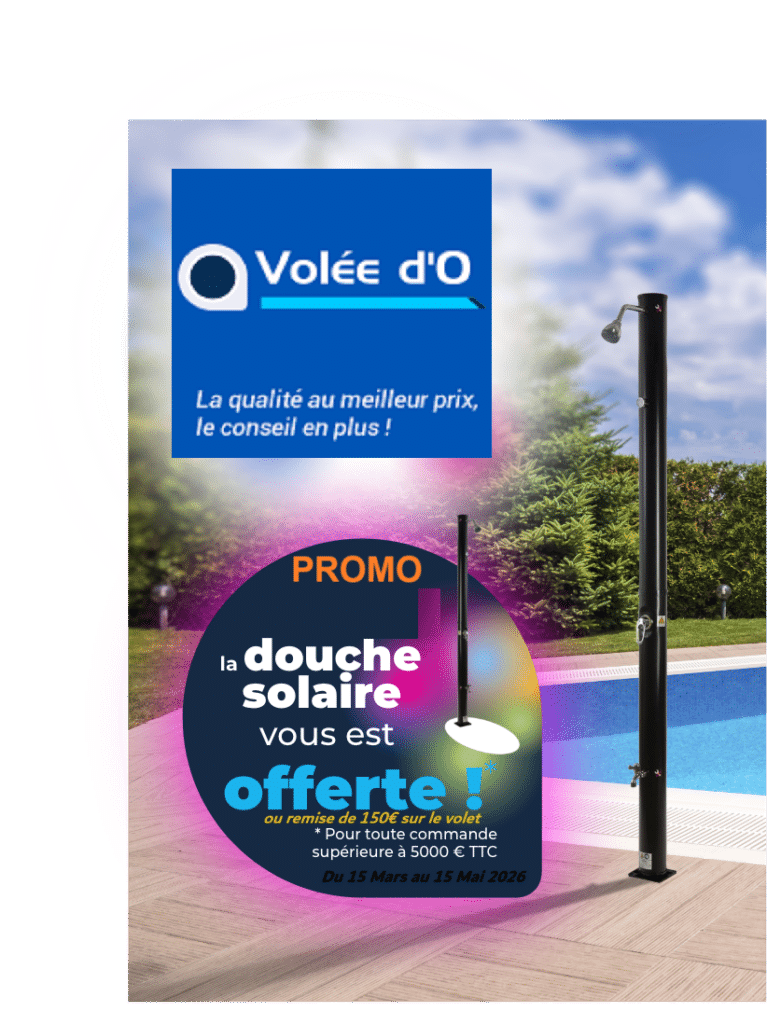Pour toute commande d’un volet hors sol JUPITER / PLUTON / MODULO / MERCURE / VENUS LUXE ou SATELITE d’une valeur minimum de 5000€ VOLEE D’O vous offre une DOUCHE SOLAIRE ou une remise équivalente de 250€